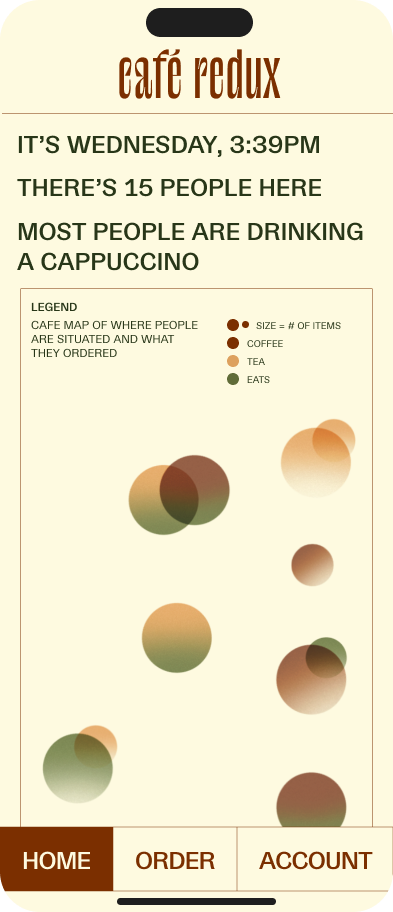 For Café Redux, I wanted to explore other ways to create a connection between a digital customer and the café, while creating a new opportunity to leverage information available on an app. The menu and ordering format is straightforward and familiar, leaning on the visual design to establish the café’s branding (and vibes, of course). In contrast, the real-time updates on the café‘s physical space creates a sense of community and provides space for Café Redux to connect with the customer past the ordering screen.
